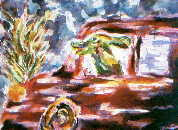 The regal dog is painted as an the 'old faithful' American flag. The bright background colors are a symbol of hope.